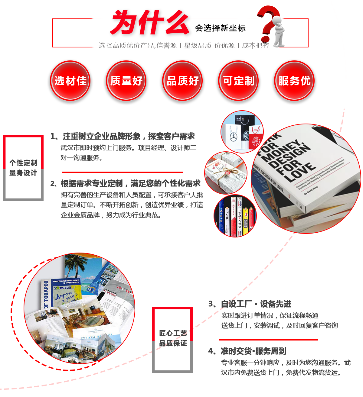 武漢新坐標包裝設(shè)計有限公司是集印刷設(shè)計包裝為一體、專業(yè)從事企業(yè)宣傳品印刷及包裝的設(shè)計及生產(chǎn)的綜合性公司。公司本著誠信為本的經(jīng)營理念,以市場為導(dǎo)向,以科技為依據(jù),注重產(chǎn)品開發(fā),不斷創(chuàng)新、不斷擴大技術(shù)力重,推陳出新,維持在該行業(yè)的領(lǐng)先優(yōu)勢。竭誠為用戶提供高品質(zhì)的產(chǎn)品和滿意的服務(wù),以嶄新的姿態(tài)迎接輝煌的未來。 專業(yè)設(shè)計生產(chǎn)精美畫冊、宣傳單張、彩色名片、產(chǎn)品樣本、廣告招貼、雜志、包裝、海報、賀卡、臺歷、掛歷、信紙、信封、禮品袋、書刊、筆記本、PVC卡、紙杯、說明書、廣告海報、單據(jù)、表格、聯(lián)單收據(jù)、無碳紙、電腦紙彩貼...... |